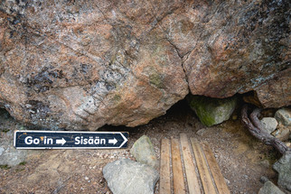 Unser erster kleiner Waldspaziergang führte uns zum Karhunpesäkivi, dem Bärenhöhlenstein von Myössäjärvi. Dabei handelt es sich um einen grossen, hohlen Findling, in den wir durch einen kleinen Spalt hineinkriechen konnten. Der Name geht auf eine alte Geschichte zurück, bei der ein Mann in der Höhle Schutz vor einem Schneesturm suchte und beim Aufwachen am nächsten Morgen feststellte, dass er neben einem Bären lag. Es lohnt sich den Treppen von der Bärenhöhle noch weiter zu folgen und die Aussicht auf die unendlichen Wälder Lapplands zu geniessen.